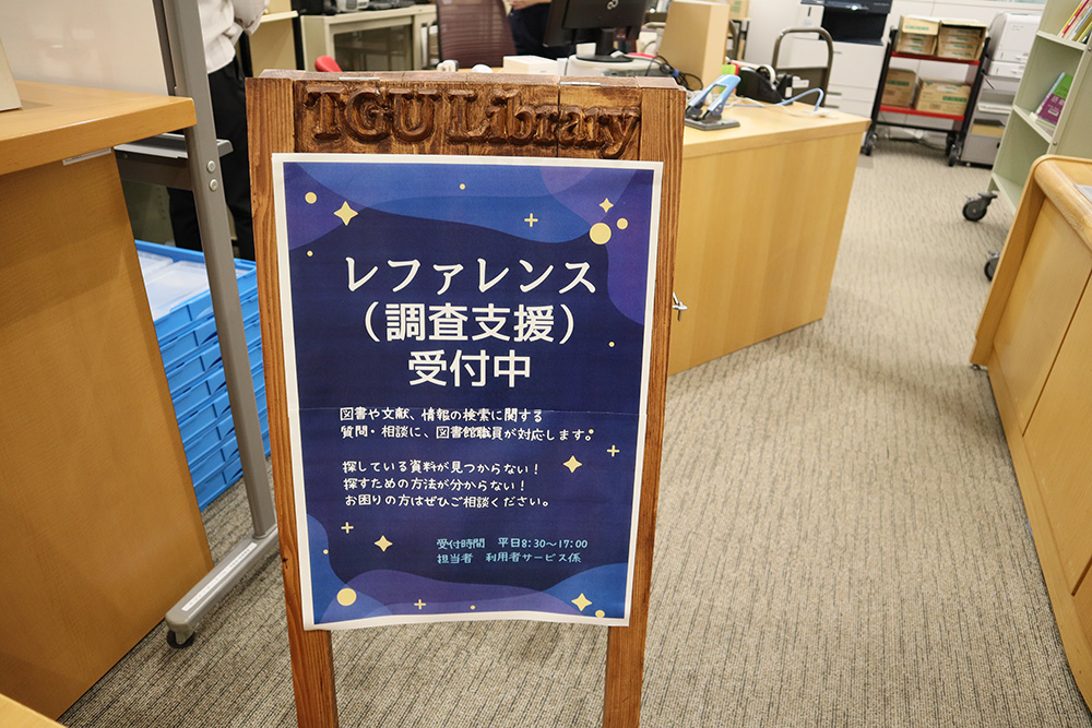 レポートや論文作成で行き詰まってしまった時は、1階受付のレファレンスコーナーへ。