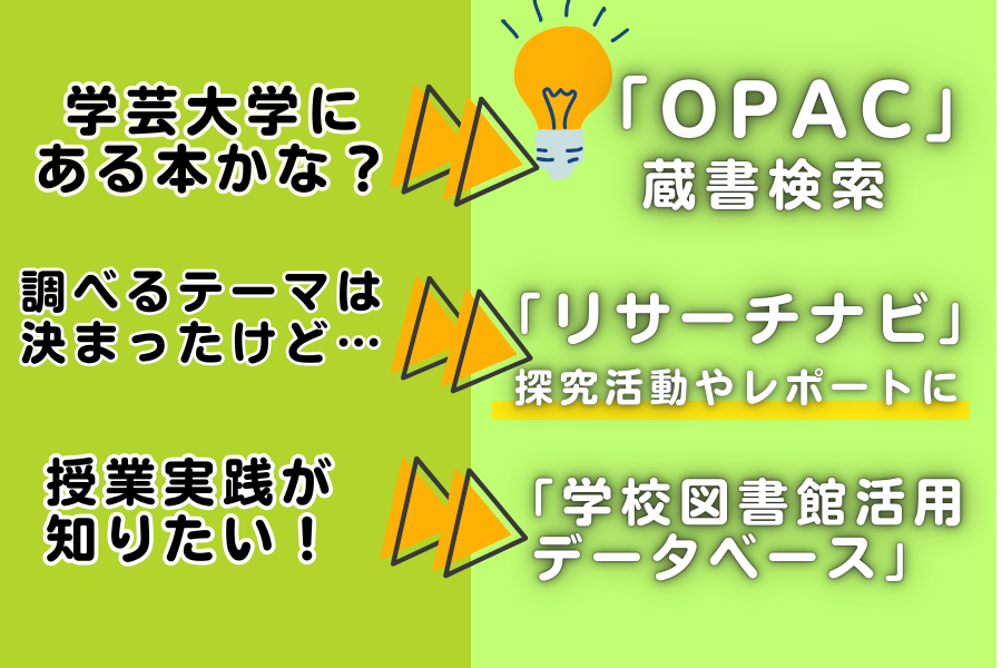 対話から利用者の要望が整理されたら、さまざまなツールを使って資料を絞っていく。学芸大学の「OPAC」や国立国会図書館の「リサーチ・ナビ」、学芸大学学校図書館運営専門委員会の「学校図書館活用データベース」を使って、資料の蔵書先を提案したり、時にはメールで返答したりする。上記のツールで得られた検索結果とにらめっこしていると、世の中の情報量に驚かされた。