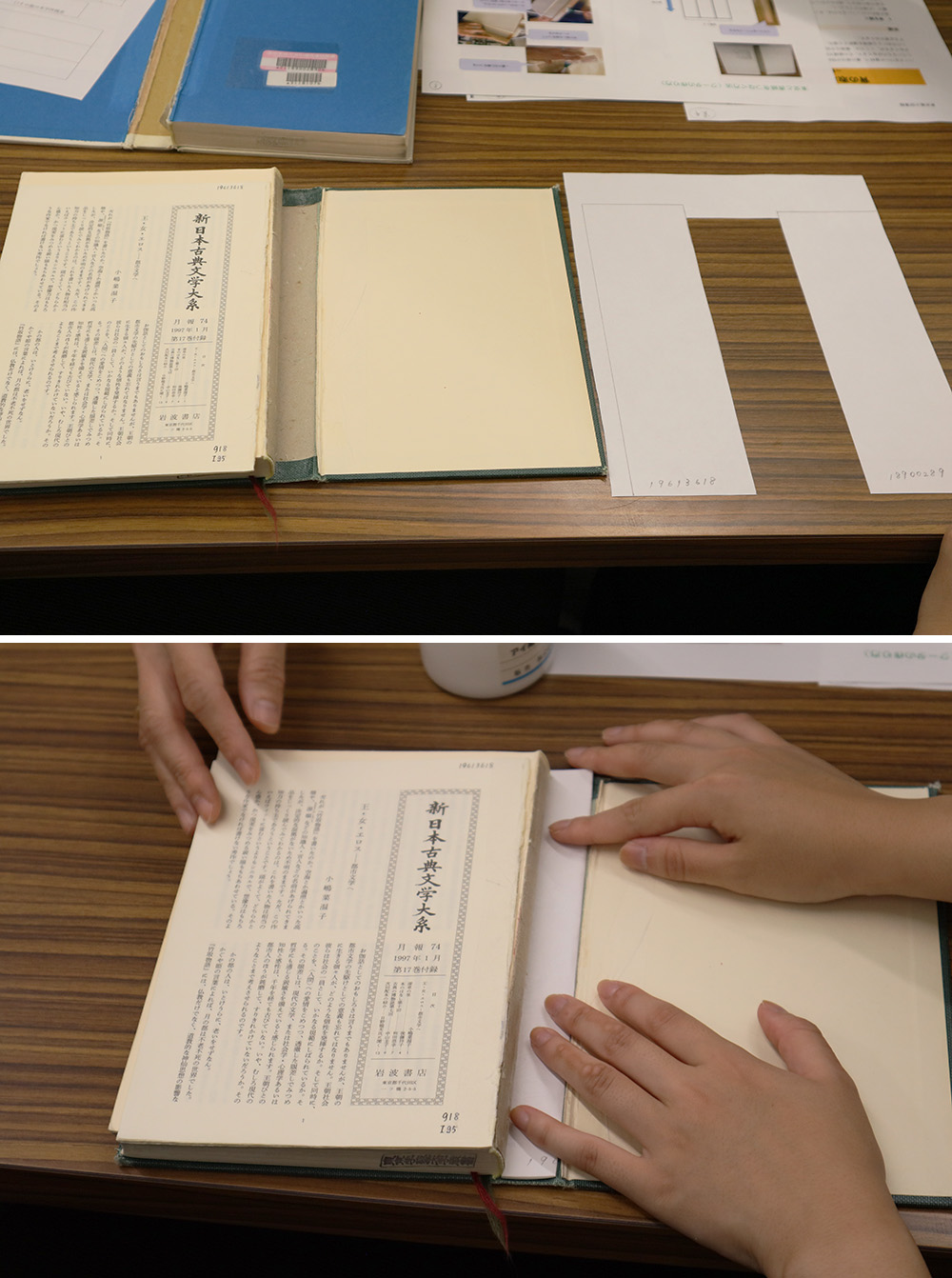 壊れた本を修理するのも大事な仕事だ。劣化で背表紙が外れてしまった「新日本古典文学大系」。担当の清水幸枝さんは丁寧に手際よく、「クータ」と呼ぶ細長い厚紙をつくり、それを背表紙と本体の背の間に貼って補強していった。市販のセロハンテープを使うとかえって劣化が早まってしまうため、本に近い素材を使うことが大切なのだ。