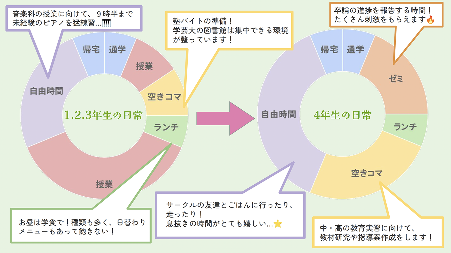 なごれんさん:学芸大学は、教育を学びたい意欲や、他者への思いやりを持っている学生が多く、過ごしやすい環境だと思います。また、小中高や特別支援教育について学べたり、いろいろな地方から学びに来る学生が多かったりと、自分の価値観や視野を広げることができるよさもあります。